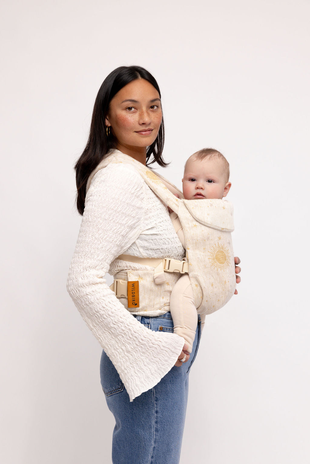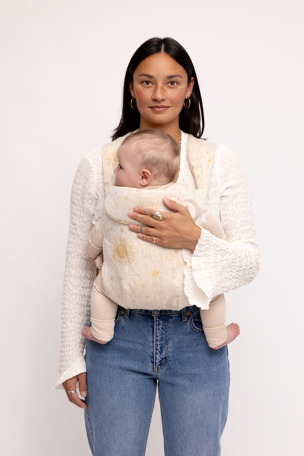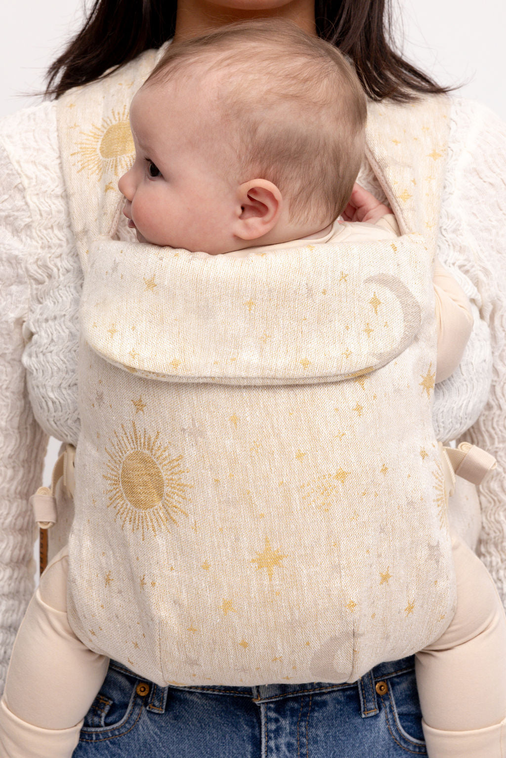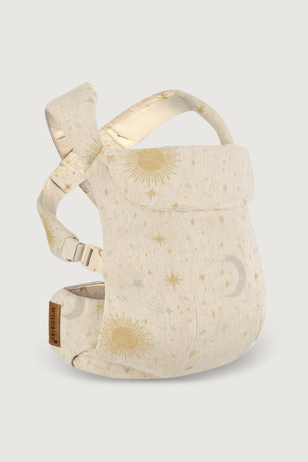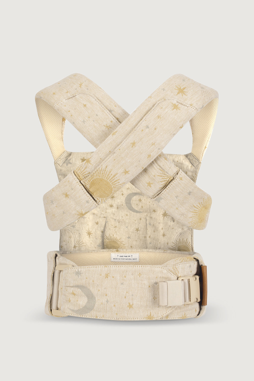 Cosmos features a delicate woven pattern of suns. stars. and moons – the dreamiest neutral carrier with a hint of charm.