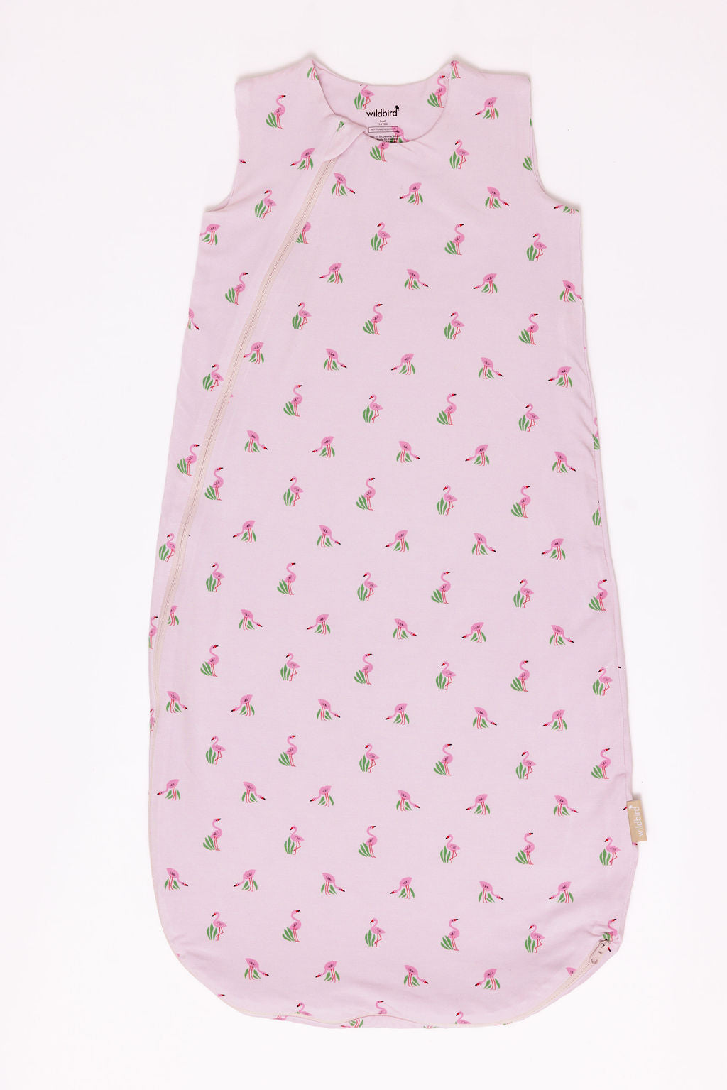 Warm blush pink with elegant flamingos and leafy green accents.