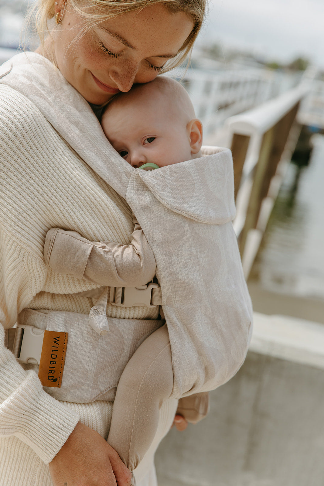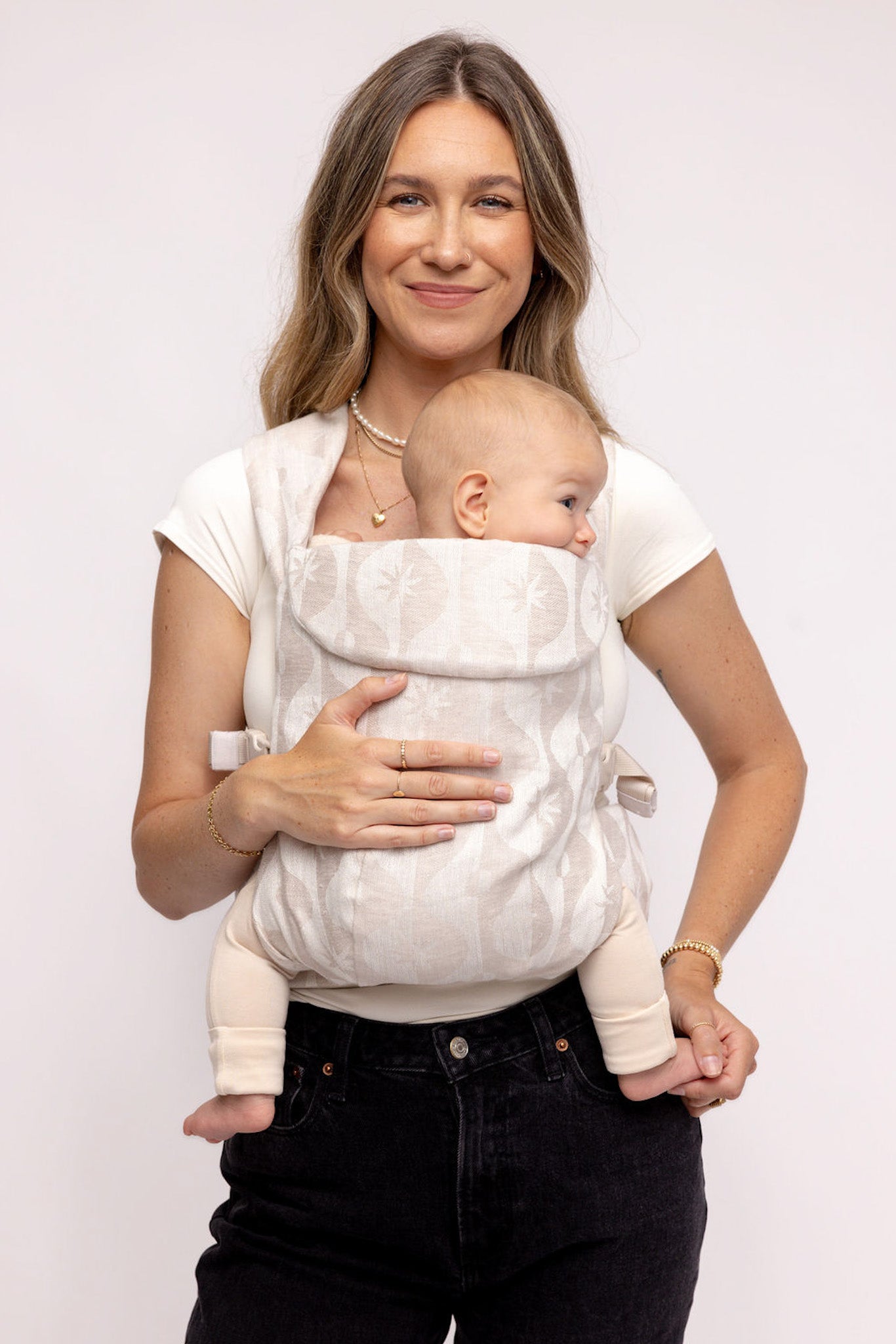 A satin weave Jacquard linen in a creamy sand base with a swirling yin yang-esque pattern of stars.